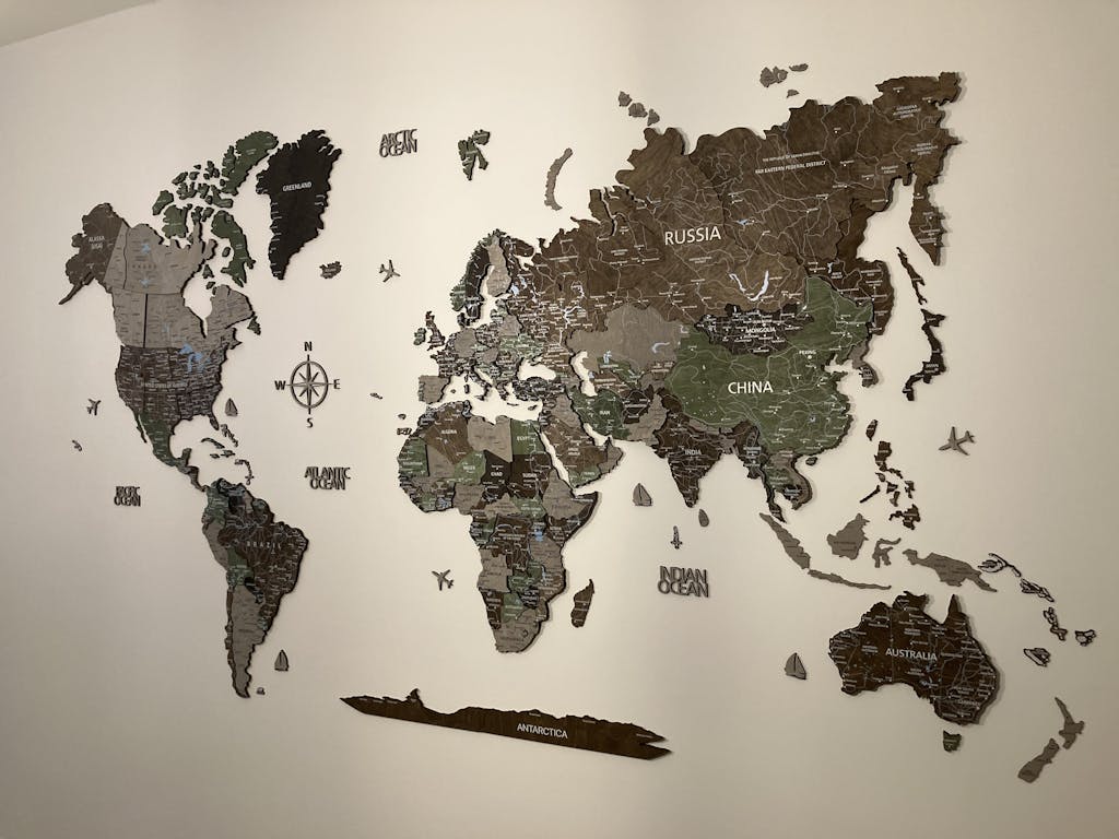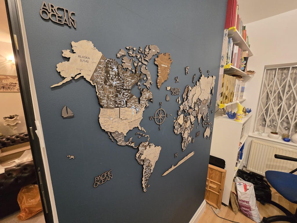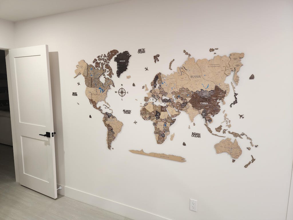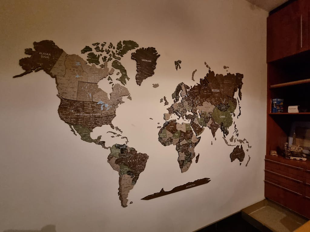 As a kid growing up in the 70's and 80's with limited TV shows and no internet, I used to study a globe we had for hours. I haven't had a globe or world map in my house since then so having this map is fantastic and I love it. I got the XL version and placed it in a room that is 13' long with a 12' high ceiling above a side cabinet. It looks very nice but I wish I got the next size up. It took a while to set up but it is worth it. Time will tell if the back-to-back tape holds up. Shipping was pretty fast to Arizona considering it is coming from Europe. I would buy this again but next time, I'd consider getting a custom (but very large) frame with a backing board made and placing it on that so I could move it if needed. My wall is light grey and not the best background for contrast especially with all the grey countries in this map. Something darker or maybe blue to replicate the oceans would be better.