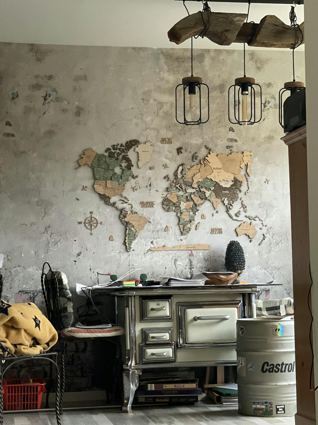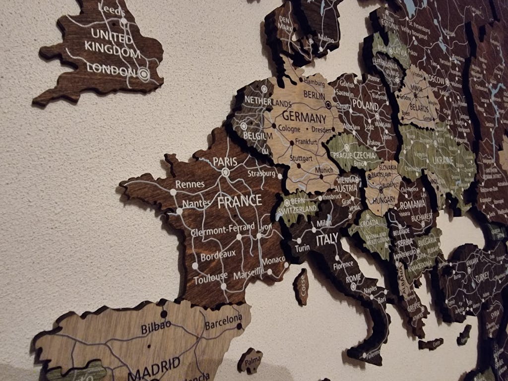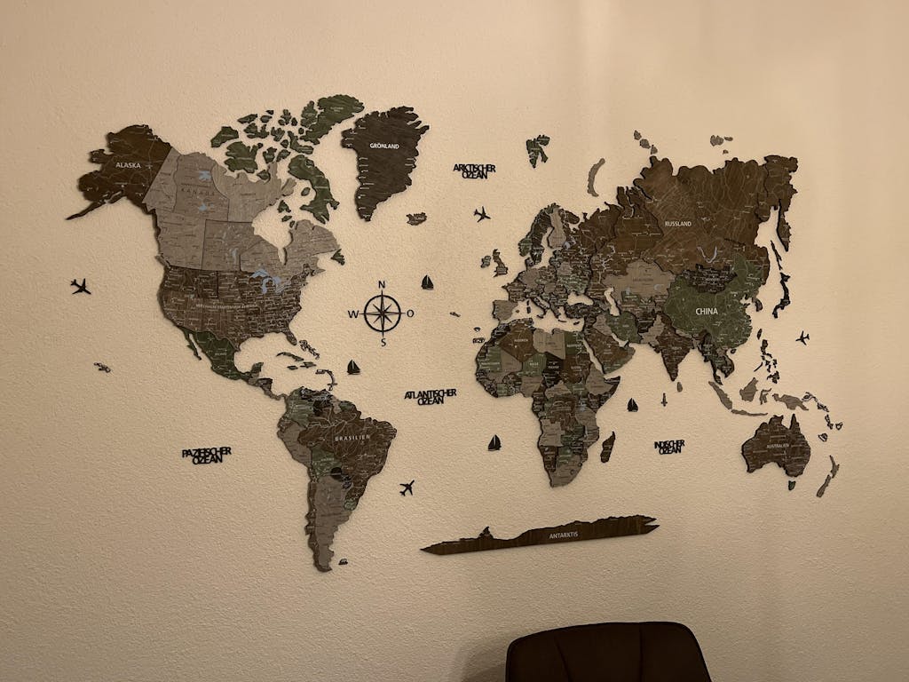Sehr wertige Umsetzung des Weltkartenthemas. Es gibt mittlerweile einige Anbieter, aber hier ist die Verarbeitung und das Finishing perfekt. Grade in Regionen, in denen viele kleiner Länder aufeinander treffen wirkt der 3D Effekt spektakulär. Der Druck ist informativ (Flüsse, Länder, Städte), aber dezent umgesetzt, sodass nichts überfrachtet wirkt.