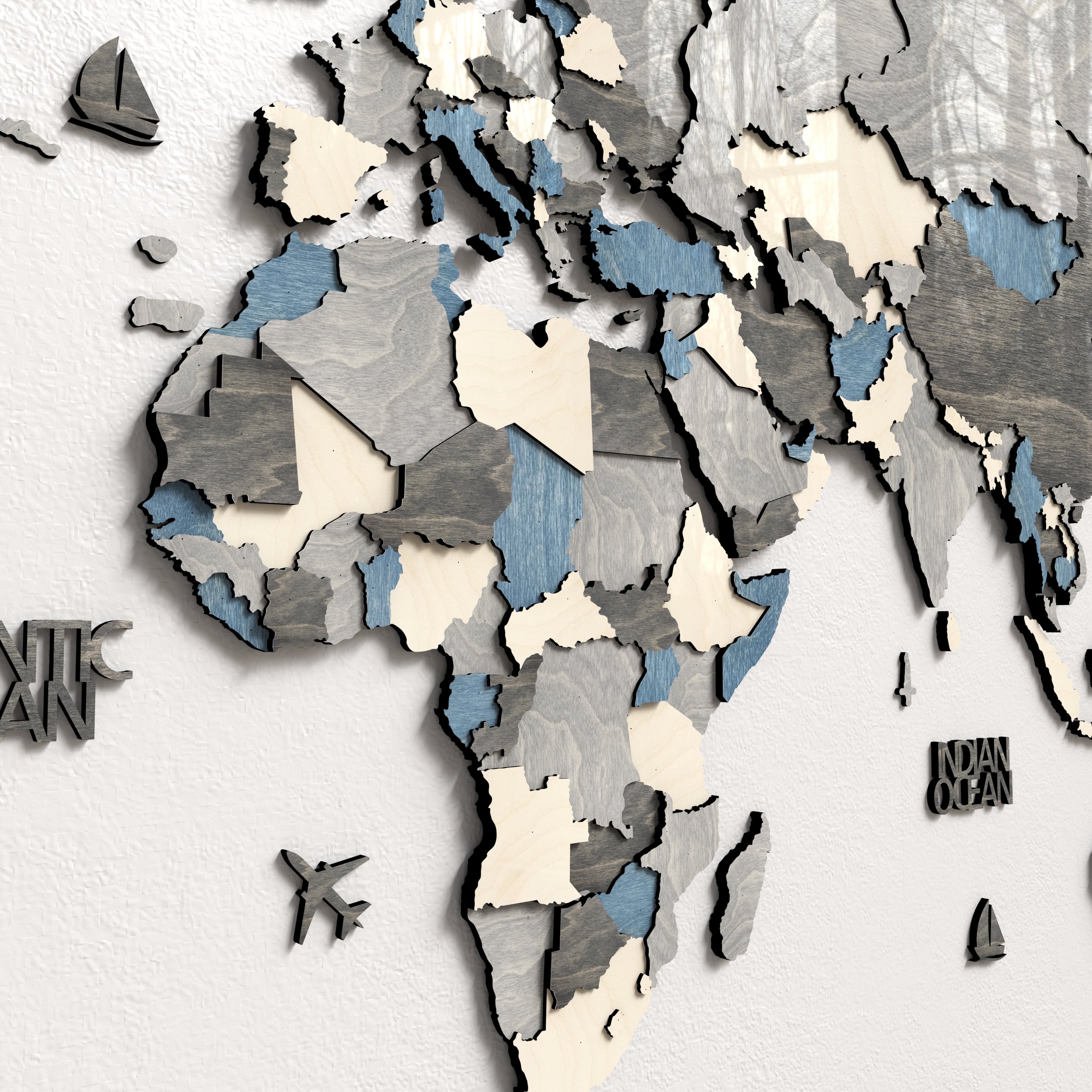 The carefully selected palette blends cool slate blues, soft greys, deep graphite tones and warm linen shades — creating a harmonious balance between Scandinavian minimalism and natural warmth. Each country in this 3D wooden world map is precisely laser-cut and layered to achieve a striking three-dimensional effect that adds depth, texture and architectural character to your wall.