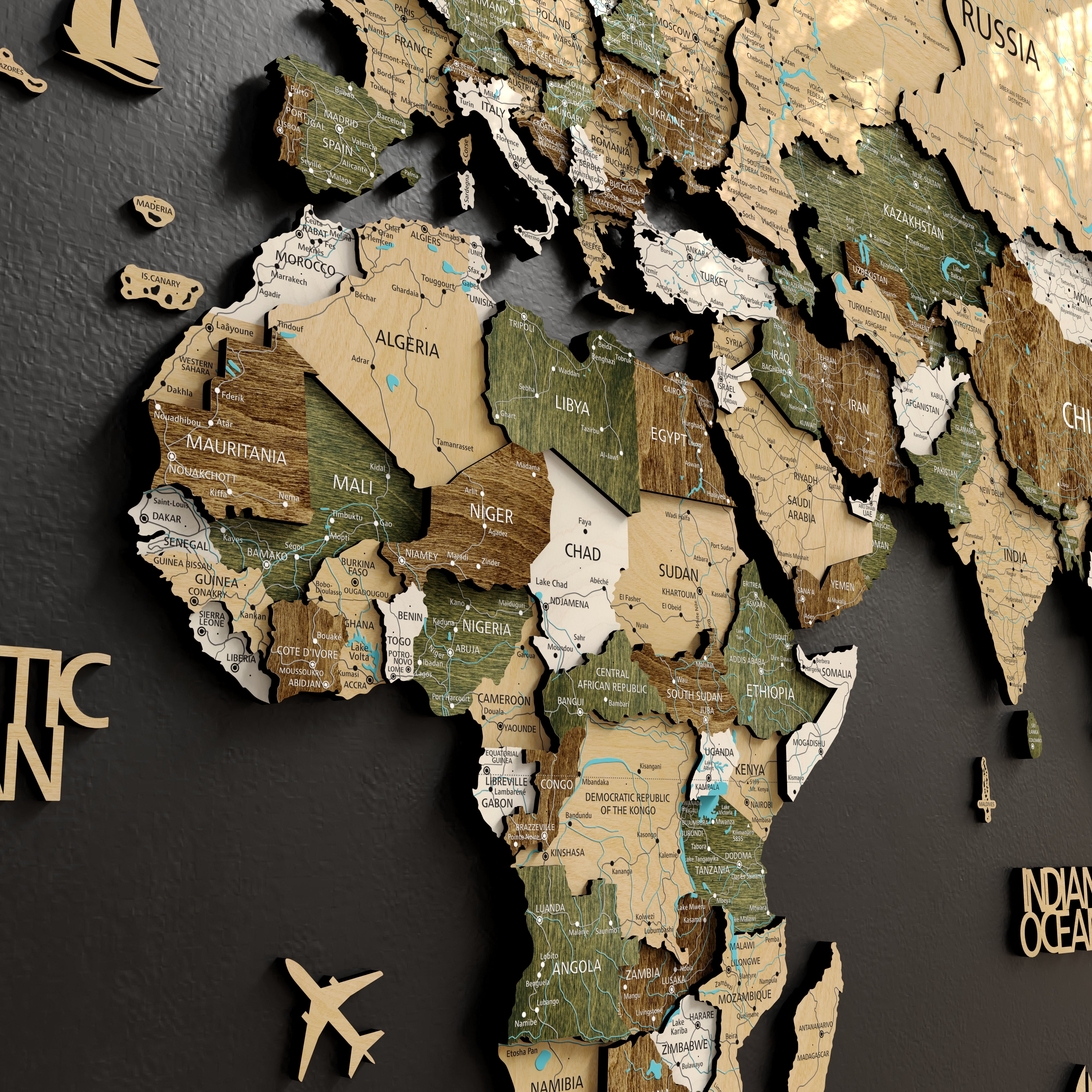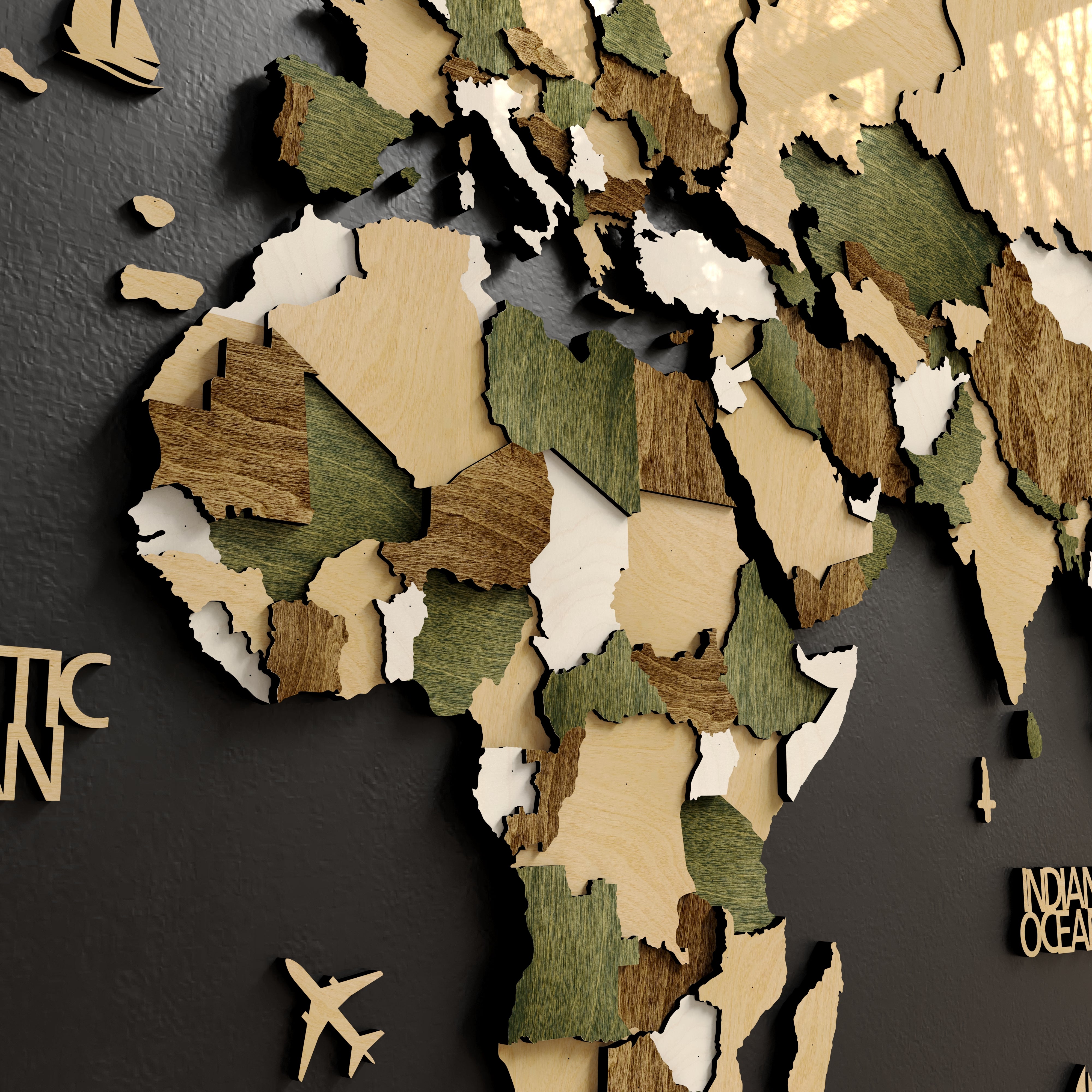 Bring your travel memories to life with our stunning 3D Wooden World Map, designed in elegant Scandinavian style. This exquisite wooden wall decor features a multi-layered structure with three different height levels, creating a captivating 3D visual effect. An innovative hidden backing enhances this dimensional depth, making the map a standout piece on any wall.