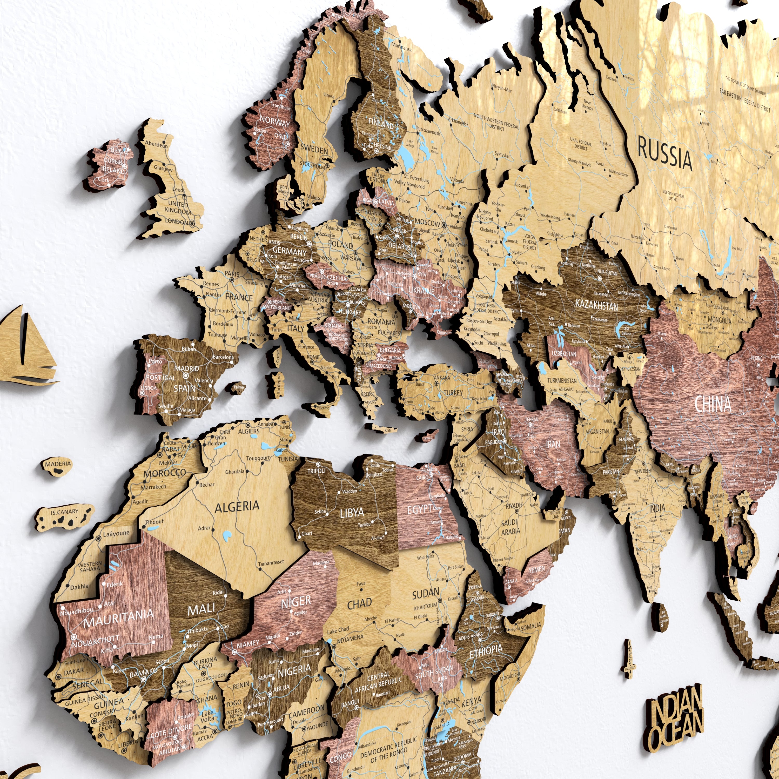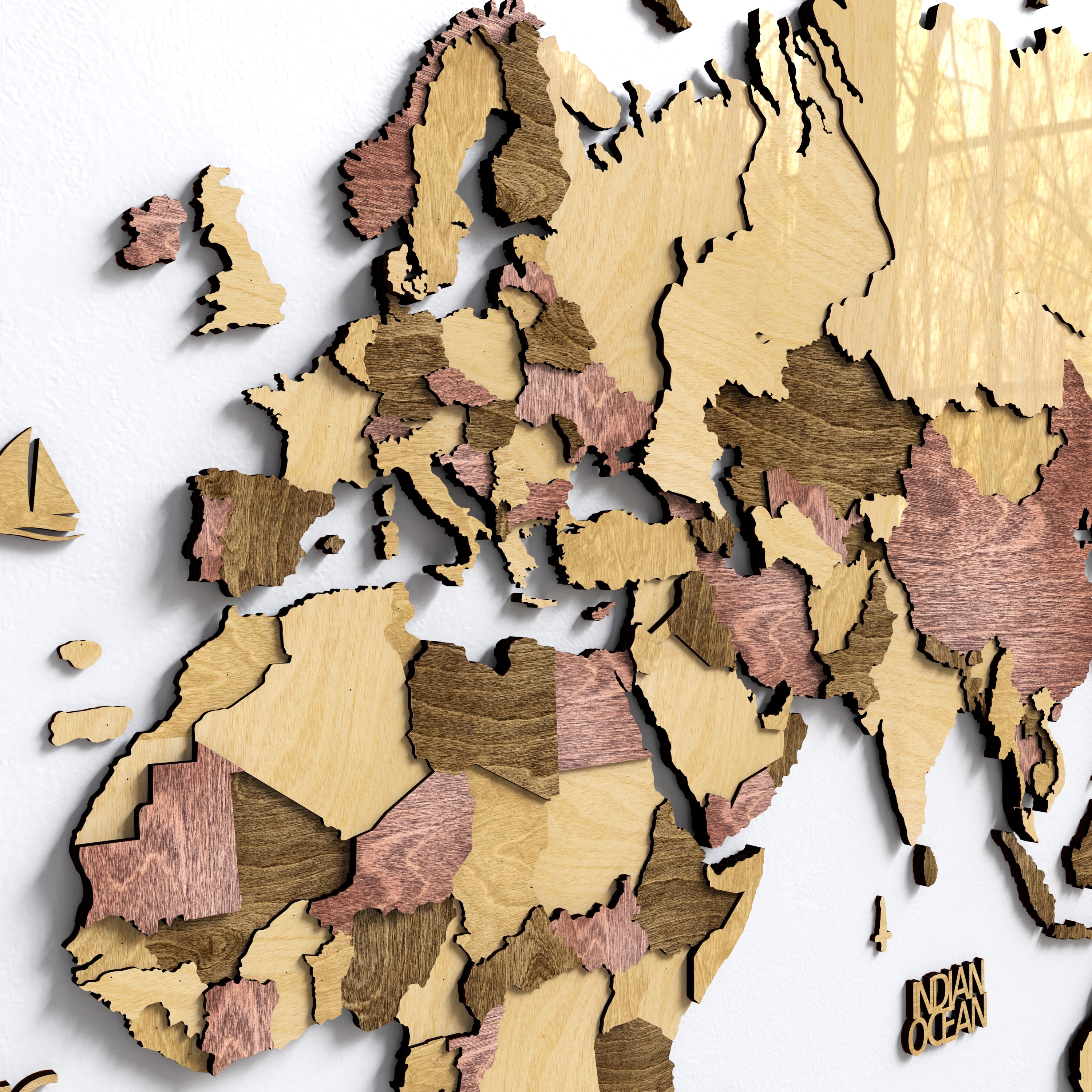 Each world map is precisely cut using high-powered laser equipment. The advanced technology ensures exceptionally clean and accurate edges, thanks to the laser's high intensity. As a result, all parts of the map fit together perfectly, creating a seamless and visually striking final piece.